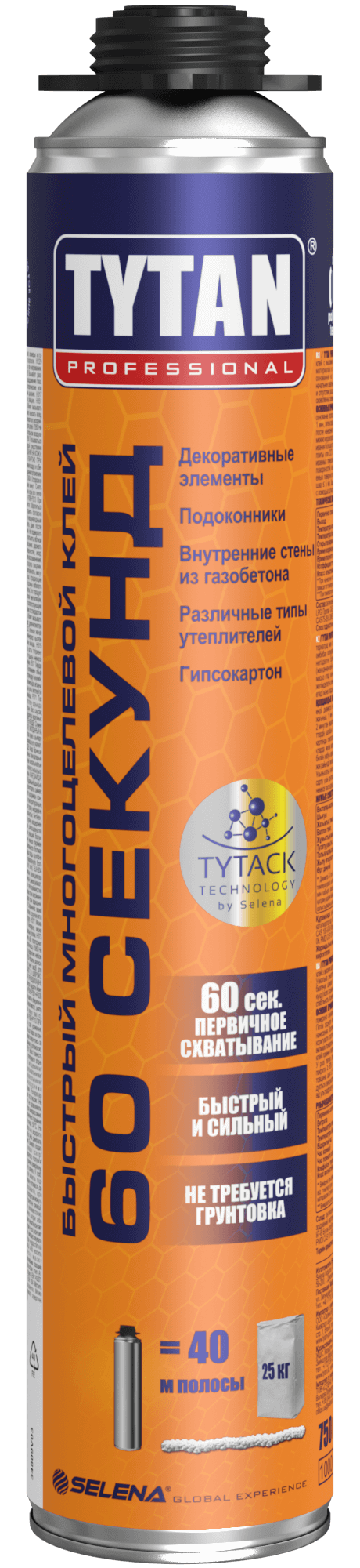 TYTAN 60 Секунд представляет собой многоцелевой клей с высокой адгезией ко многим материалам и основаниям. Уникальная формула на основе TYTACK технологии дает быстрое начальное схватывание после 60 секунд без расширения, что обеспечивает стабильность склеиваемых элементов и предотвращает их деформацию.